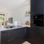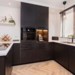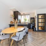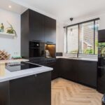 De keuken is aan de voorzijde van de woning gesitueerd en is uitgerust met een geheel strak keukenblok. Door de U-opstelling heb je hier ruim voldoende werk- en opbergruimte en uiteraard is de keuken voorzien van alle gemakken zoals een inductie kookplaat met geïntegreerde afzuigkap, Quooker, combimagnetron en vaatwasser.