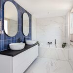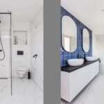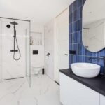 De nieuwe badkamer heeft een moderne en luxe uitstraling door de kleur- en materiaalkeuze. Deze privé wellness is voorzien van een ligbad met thermostaatkraan, zeer ruime inloopdouche met hand- en stortdouche en thermostaatkraan, dubbel wastafelmeubel, spiegels die voorzien zijn van verwarming en verlichting, hangend closet en een designradiator. Prettig is de dubbele raampartij welke zorgt voor daglicht en natuurlijke ventilatie.