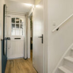 uitgebouwde hal met PVC-vloer met vloerverwarming, glad gestucte wanden -en plafond, garderobe, meterkast, trapopgang en modern toilet met hangend closet en fonteintje.