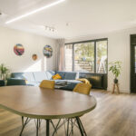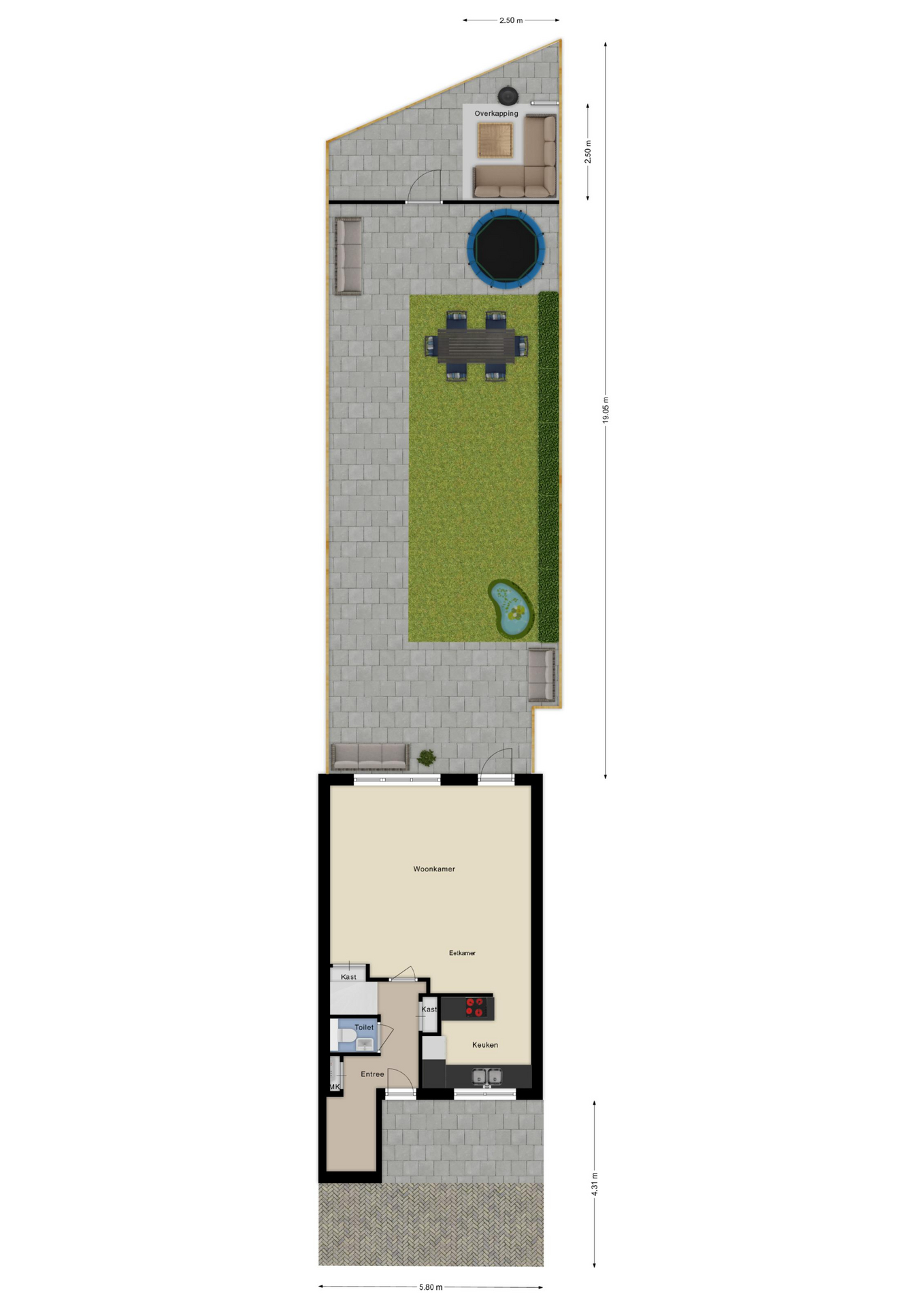 De tuingerichte woonkamer is ruim van afmeting, licht door de grote raampartij en stijlvol afgewerkt met een PVC-vloer met vloerverwarming, glad gestucte wanden -en plafond. Via de achterdeur is de grote tuin direct toegankelijk.