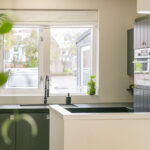 U-opstelling met composiet aanrechtblad, koelkast, inductiekookplaat met ingebouwde afzuigkap, combimagnetron en vaatwasser.