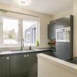 De halfopen keuken bevindt zich aan de voorzijde en is voorzien van een verzorgd keukenblok in