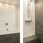 De modern afgewerkte badkamer is geheel betegeld en voorzien van een ligbad met ingebouwde kranen, grote inloopdouche met dubbele douche, zitje en thermostaatkraan, wastafel, hangend closet, designradiator en kunststof raamkozijn.
