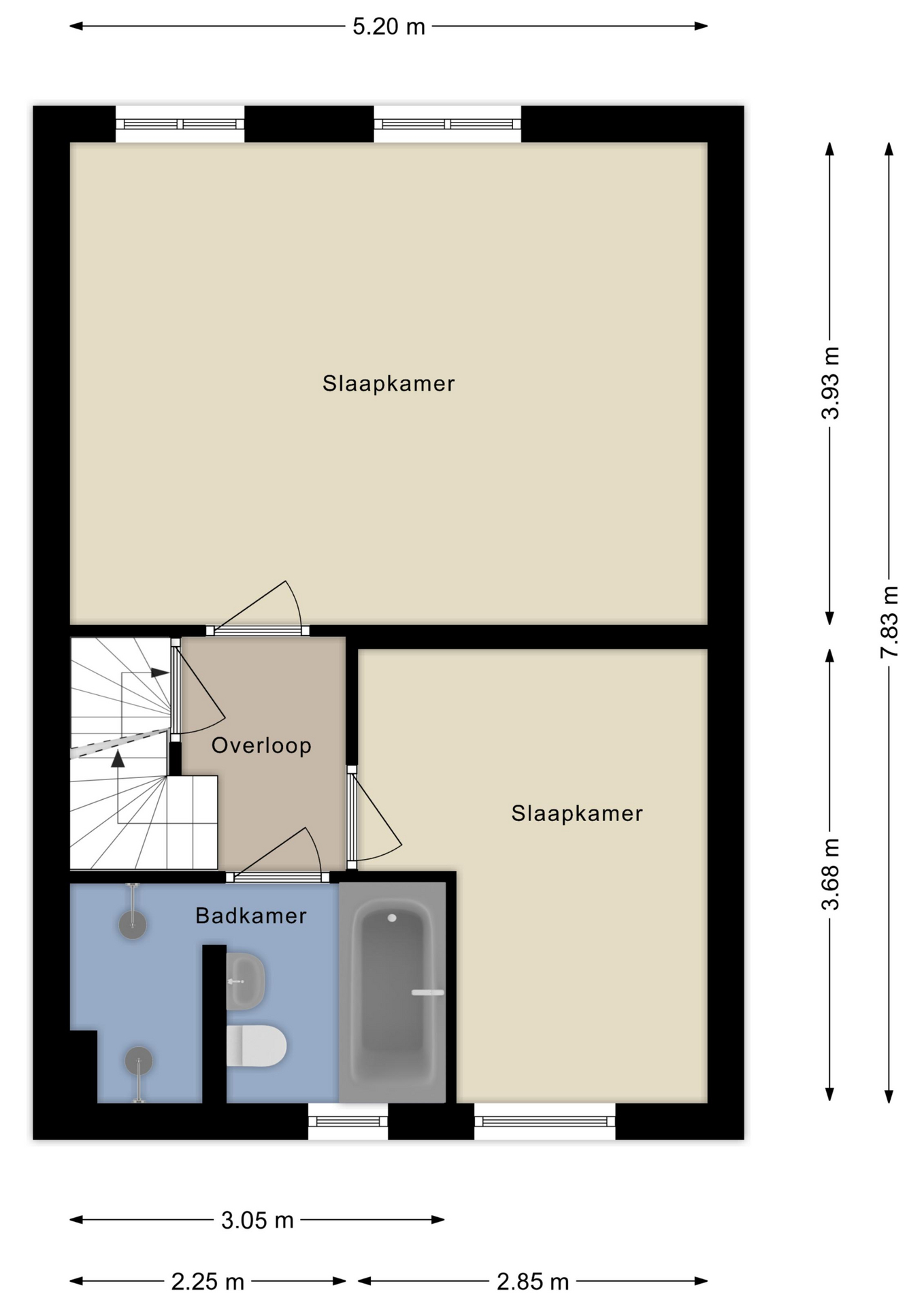 Deze 1e verdieping beschikt over twee (voorheen drie) royaal bemeten slaapkamers, die beide zijn voorzien van een laminaatvloer en glad gestucte wanden en kunststof kozijnen. De grootste kamer ligt aan de achterzijde en is tevens voorzien van een vaste kastenwand.