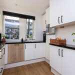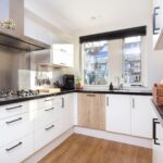 De keuken ligt aan de voorzijde van de woning en is voorzien van een U-vormig keukenblok met composiet blad, veel werk- en kastruimte en inbouwapparatuur: 5-pits gaskookplaat, RVS-afzuigkap, vaatwasser, koelkast, combimagnetron en plintboiler.