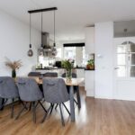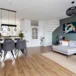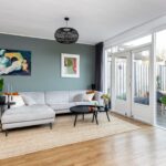 De tuingerichte woonkamer is heerlijk licht door de openslaande deuren en tuindeur en is afgewerkt met stijlvolle PVC-vloer met vloerverwarming en glad gestucte wanden.
