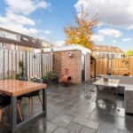 De vrij gelegen en ruim bemeten achtertuin is modern aangelegd met sierbestrating, border en nieuwe schuttingen. De tuin beschikt over een stenen berging en een houten fietsenberging, buitenverlichting, elektra, zonwering en achterom naar het achtergelegen parkeerhofje.