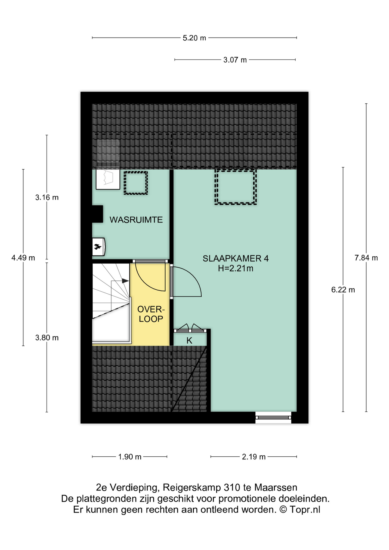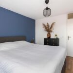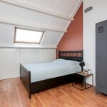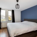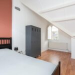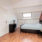 Op deze verdieping is tevens de vierde slaapkamer te vinden. Deze kamer is door de topgevel aan de voorzijde extra ruim en speels ingedeeld en is voorzien van een laminaatvloer, glad gestucte wanden, hoog plafond, Velux-raam en bergruimte achter de knieschotten met schuifdeuren.