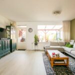 De ruime en tuingerichte woonkamer is heerlijk licht door de grote raampartij en tuindeur en is afgewerkt met een laminaatvloer en glad gestucte wanden.