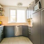 De keuken ligt aan de voorzijde van de woning en is voorzien van een U-vormig keukenblok met veel werk- en kastruimte en inbouwapparatuur: koelkast, 5-pits gaskookplaat, RVS-afzuigkap en vaatwasser.