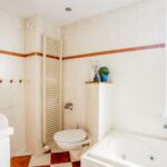 De gemoderniseerde badkamer is ruim van afmeting, geheel betegeld en voorzien van een ligbad met jetstreams en thermostaatkraan, douchecabine met massagedouche en thermostaatkraan, badmeubel met wastafel, hangend closet, designradiator, kunststof raamkozijn en glad gestuct plafond met inbouwspots.
