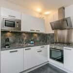 De halfopen keuken is aan de voorzijde gesitueerd en voorzien van modern keukenblok in hoekopstelling met koel-/vriescombinatie, 5-pits gaskookplaat, heteluchtoven, magnetron, RVS-afzuigkap, RVS-afzuigkap (recirculatie) en veel werk- en kastruimte.