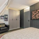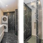 De moderne en luxe badkamer is geheel betegeld en voorzien van een inloopdouche met regen- en handdouche en thermostaatkraan, wastafelmeubel, spiegelkast met verlichting, designradiator, hangend closet en glad gestuct plafond met ledverlichting. Tevens tref je hier de aansluitingen aan voor de wasmachine en droger.