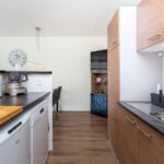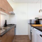 De open keuken heeft houtlook kastjes en een antraciet grijs aanrechtblad. Door de parallel opstelling is er veel werkbladruimte en opbergruimte ontstaan. De keuken is voorzien van diverse (inbouw)apparatuur; 4-pits gasfornuis, afzuigkap, oven, vaatwasser (ter overname) en koelkast.