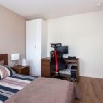 De slaapkamer bevindt zich aan de voorzijde, is circa 13 m² groot en voorzien van een mooie laminaatvloer, structuurmuren en elektrische rolgordijnen (ter overname).