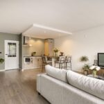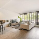 De woonkamer is gelegen aan de achterzijde van het appartement en is met een oppervlakte van circa 26m2 heerlijk ruim van afmeting. Via de woningbrede raampartij met balkondeur is er aangenaam veel lichttoetreding en kijk je tevens vrij uit over de singel. De living is voorzien van een laminaatvloer, glad gestucte wanden -en plafond en via de balkondeur bereik je het ruime en zonnig terras, dat is gelegen op het zuidwesten, is voorzien van houten vlonderdelen en fraai uitzicht biedt over de singel en de groene woonomgeving.