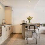De halfopen keuken heeft een modern, recht blok met vrijstaand werkeiland met leuke eetbar en veel werk- en kastruimte. De keuken is voorzien van diverse inbouwapparatuur, te weten; koel-/vriescombinatie, inductie kookplaat, combimagnetron en RVS-afzuigkap (recirculatie).