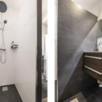 De strak en modern afgewerkte badkamer is volledig betegeld en voorzien van een grote inloopdouche met thermostaatkraan en regen- en handdouche, badmeubel met wastafel, hangend closet, wasmachineaansluiting en glad gestuct plafond.