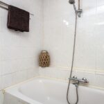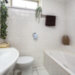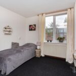 Via de trapopgang bereik je de overloop op de eerste verdieping. Hier heb je toegang tot twee slaapkamers en een badkamer. Zowel aan de voor- als achterzijde vind je een riante slaapkamer. De slaapkamer aan de achterzijde strekt zich uit over de gehele breedte van de woning. Stijlvolle houten wand- en plafondpanelen maken de kamer bijzonder sfeervol. Het is bovendien aangenaam licht in de kamer en er ligt een prachtige laminaatvloer. De slaapkamer aan de voorzijde is voorzien van een vloerbedekking. Deze kamer beschikt over een grote inbouwkast met schuifdeuren. De badkamer is betegeld en uitgerust met een ligbad, wastafelmeubel en toilet. De badkamer kan een moderniseringsslag gebruiken.