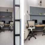 Entree, hal met strakke, gecoate betonvloer met vloerverwarming, glad gestucte wanden en plafond, meterkast, luxe, geheel betegelde toiletruimte met hangend closet en fonteintje, moderne paneeldeuren, garderobekast, trapopgang en zwart aluminium schuifdeur naar de comfortabele en lichte werkkamer met PVC-vloer, glad gestucte wanden -en (hoog) plafond met bergvliering.