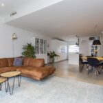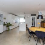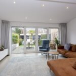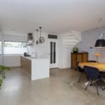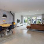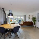 De tuingerichte living is door de uitbouw zeer ruim van afmeting en bovendien enorm licht dankzij de brede glazen achterpui met openslaande deuren. De living is stijlvol afgewerkt met de gecoate betonvloer (voorzien van vloerverwarming), glad gestucte wanden -en plafond en fraaie houtkachel.