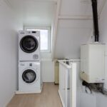 Grote voorzolder met dakkapel en kunststof Velux-raam, laminaatvloer, CV-opstelling, wasmachine- en drogeraansluiting en bergruimte achter de knieschotten.