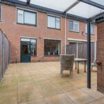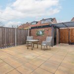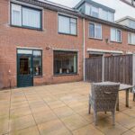 Vanuit de woonkamer is de achtertuin te bereiken met een stenen berging en een handige achterom, ideaal voor fietsen en tuinspullen.
