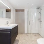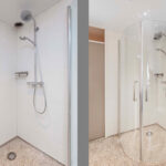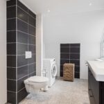 De vernieuwde, grote badkamer is praktisch ingericht met een douche, toilet en de aansluiting voor de wasmachine.