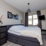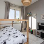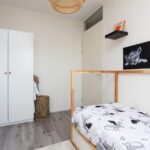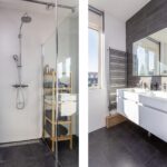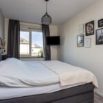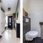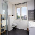 Via de ruime overloop bereik je drie comfortabele slaapkamers, allemaal netjes afgewerkt met laminaatvloeren en strakke wanden. De luxe badkamer is een echte eyecatcher: stijlvol betegeld in grijs/wit, met een ruime inloopdouche voorzien van regendouche, dubbele wastafel met meubel, tweede toilet en designradiator.