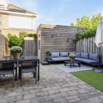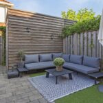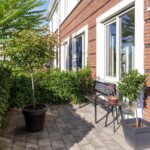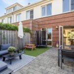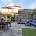 De zonnige achtertuin is strak aangelegd met siertegels en een strook kunstgras (hieronder liggen de tegels door). Hier kun je heerlijk loungen of uitgebreid tafelen in de zon.