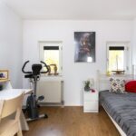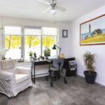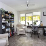 De slaap-/werkkamer is lekker ruim en licht, voorzien van dezelfde PVC tegellook vloer, ventilator en brede raampartij die mooi vrij uitzicht biedt op de straat, groenstrook en water.