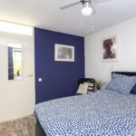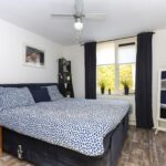 De slaapkamer is voorzien van een mooie laminaatvloer, ventilator en groot raam dat vrij uitzicht biedt op de straat, groenstrook en water.