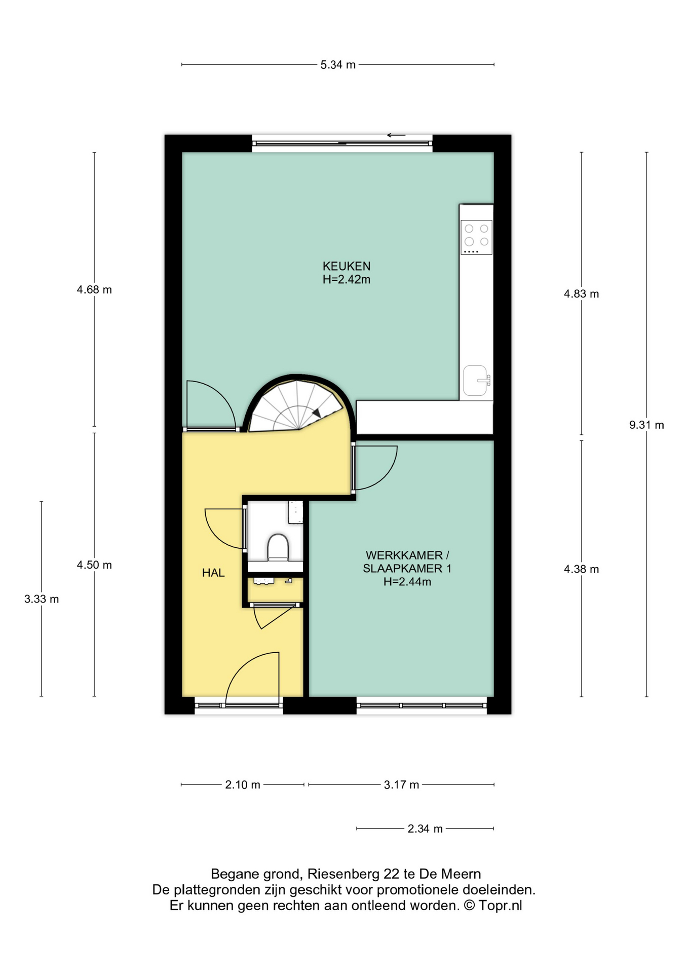 De voordeur geeft toegang tot de ruime hal met daarin een nieuwe PVC tegellook vloer, meterkast, nieuw toilet met fonteintje en de prachtige wenteltrap richting de 1e verdieping. Vanuit de hal bereik je de keuken en slaap-/werkkamer.