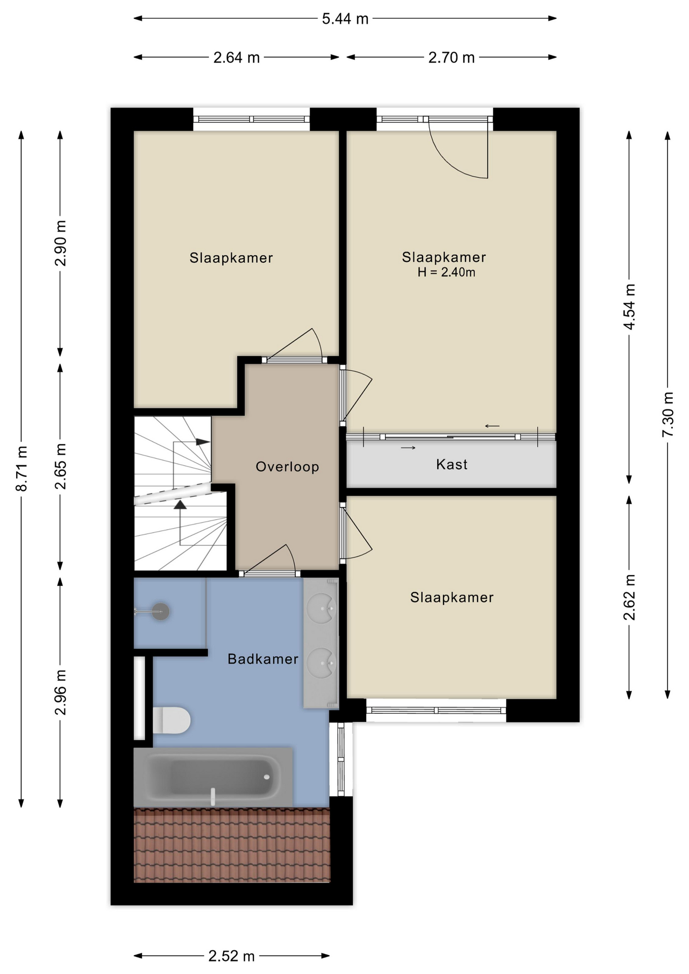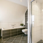 Overloop die toegang biedt tot de badkamer en de 3 slaapkamers. Aan de achterzijde bevinden zich 2 slaapkamers. Aan de voorzijde is de derde slaapkamer. De moderne badkamer met ligbad, douche, toilet, dubbel wastafelmeubel is tevens aan de voorzijde aanwezig.