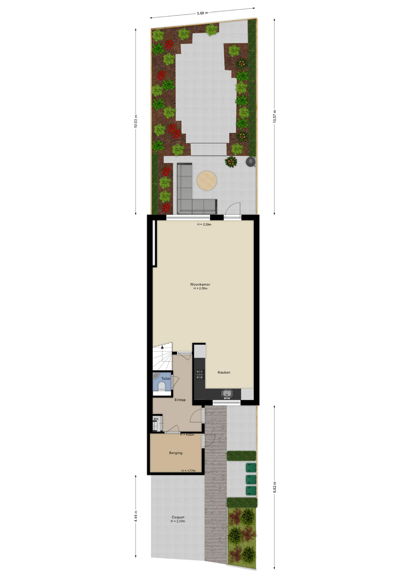 Oprit en carport met de mogelijkheid voor een laadpunt, én een praktische stenen berging die zowel van binnenuit als van buitenaf toegankelijk is