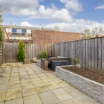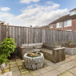 De tuin is verzorgd aangelegd en voorzien van twee elektrapunten, een waterkraan, een achterom en een nieuwe schutting aan de rechterzijde (2022). Aan de voorzijde van de woning bevindt zich een stenen berging met elektra.