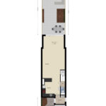 Aan de voorzijde bevindt zich de open keuken, compleet uitgerust met diverse inbouwapparatuur, waaronder een inductie Smeg-fornuis met oven, afzuigkap, koelkast, vaatwasser, magnetron en een gezellig barretje.
