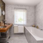 De geheel betegelde badkamer is voorzien van een tweede toilet, een ingebouwde dubbele wastafel, separate douche en een ligbad.