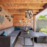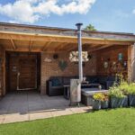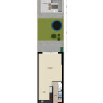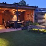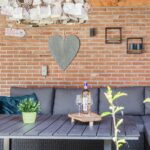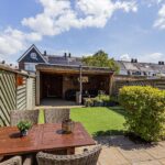 • Diepe tuin met terrasoverkapping, stenen berging en achterom