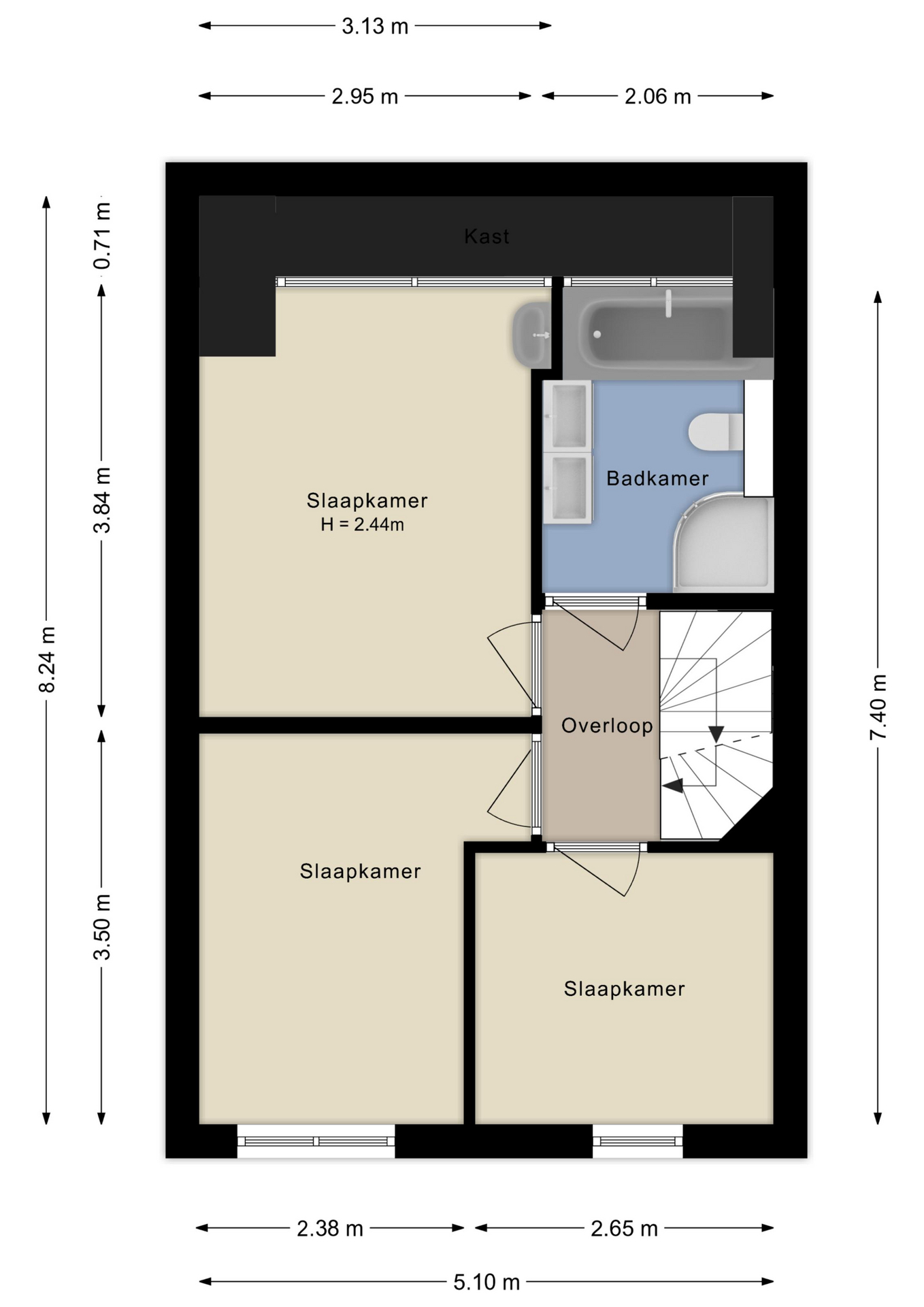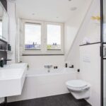 Overloop met toegang tot drie slaapkamers. De slaapkamer met airco en badkamer aan de achterzijde zijn vergroot dankzij een dakkapel. De badkamer (2008) is voorzien van een ligbad, separate douche, dubbele wastafel, toilet en elektrische vloerverwarming.