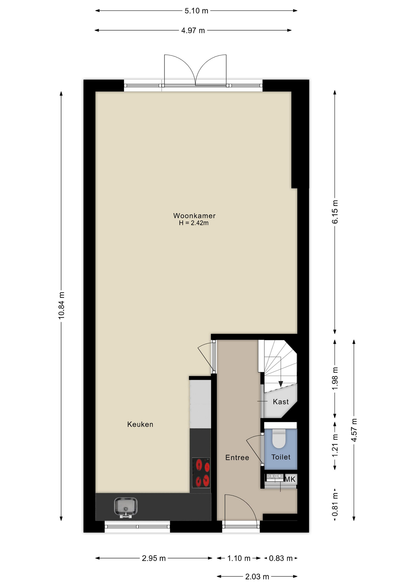 Entree met meterkast, moderne toiletruimte en trapopgang. Zeer lichte, uitgebouwde woonkamer met nieuwe PVC visgraatvloer, vloerverwarming, airco en strakke afwerking. Openslaande deuren naar de tuin. De open keuken aan de voorzijde is goed uitgevoerd met o.a. inductiekookplaat, vaatwasser, combi-oven, separate oven en koel-vriescombinatie.