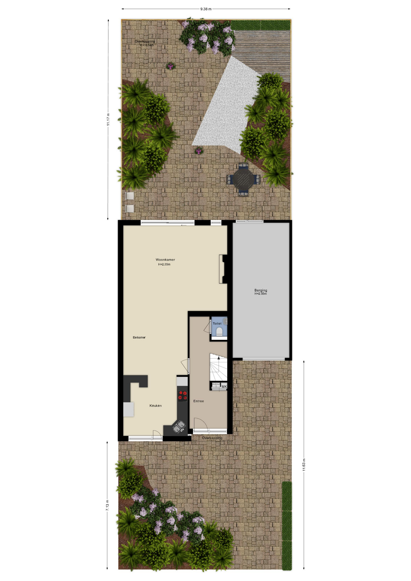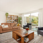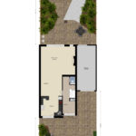 Bij binnenkomst word je verwelkomd in een ruime hal met garderoberuimte, een toiletruimte, de meterkast en een praktische trapkast. Vanuit de hal stap je de lichte en uitnodigende woonkamer binnen. Dankzij de grote vloer-tot-plafondramen aan de achterzijde baadt deze ruimte het hele jaar door in het daglicht.