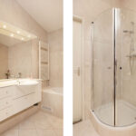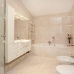 De badkamer is compleet en stijlvol ingericht met een douche, ligbad, wastafel, bidet en een tweede toilet – een fijne, praktische ruimte voor het hele gezin. De badkamer is zelfs voorzien van