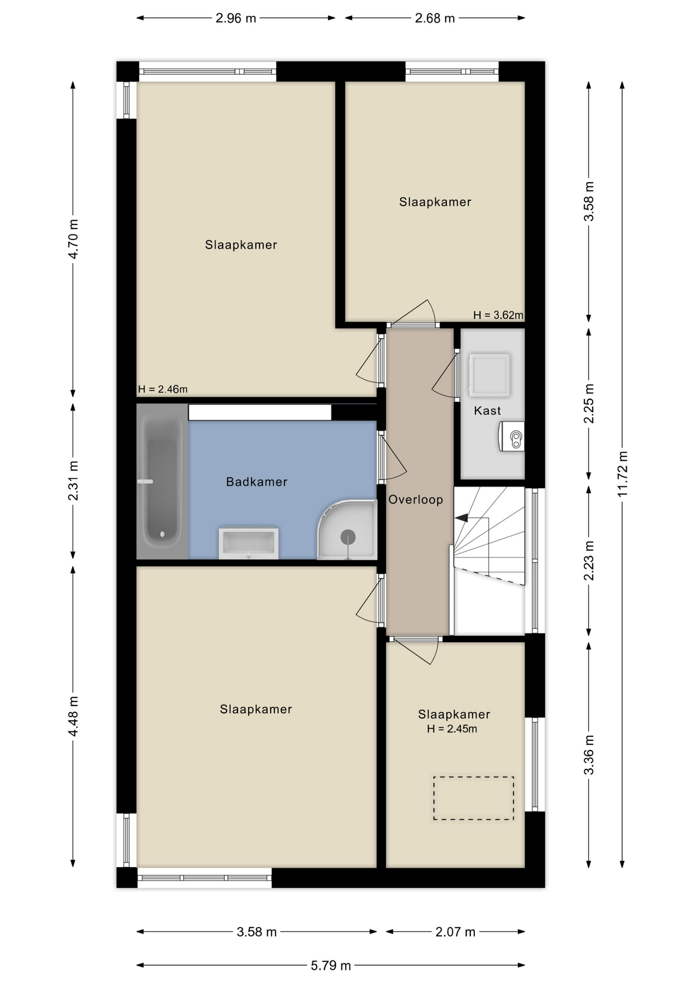 De ruime en lichte overloop biedt toegang tot vier comfortabele slaapkamers, ideaal voor een groter gezin, thuiswerkplekken of een inloopkast. De slaapkamers zijn verschillend van formaat, maar stuk voor stuk prettig en licht. De masterbedroom bevindt zich aan de voorzijde, tevens ook de kastenkamer.