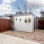 Met zowel een heerlijke voor- als achtertuin kun je volop van de zon en het buitenleven genieten. De voortuin is op speelse wijze betegeld en biedt een fijne zithoek met uitzicht op het water. De voortuin is omheind door een elegant hekwerk. De achtertuin bereik je via openslaande deuren in de woonkamer. De tuin is volledig betegeld en daarmee onderhoudsvrij. Hier kun je verschillende eet- of zithoeken creëren en het buitenleven met volle glorie omarmen. Achterin vind je een ruime berging, die plek biedt aan je fietsen. Ook is er een achterom, zodat je je fiets direct in de berging kunt plaatsen. Een sfeervolle houten schutting zorgt voor veel privacy in de achtertuin.