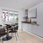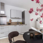 De open keuken is aan de voorzijde van het appartement gelegen en is voorzien van een modern, recht keukenblok met koel-/vriescombinatie, gaskookplaat, RVS-afzuigkap (recirculatie) en voldoende kastruimte.