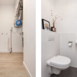 Entree, hal met laminaatvloer, gestucte wanden, videofoon, meterkast, moderne toiletruimte met hangend closet en fonteintje en inpandige berging met CV-opstelling, wasmachine- en drogeraansluiting en bergruimte.