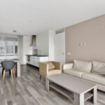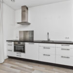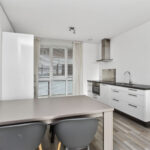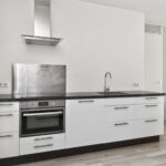 De open keuken is aan de voorzijde van het appartement gelegen en is voorzien van een modern, recht keukenblok met vaatwasser, kookplaat, RVS-afzuigkap (recirculatie) en voldoende kastruimte. Tegenover het keukenblok is er extra kastruimte en de koelkast.