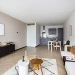 De living is ruim van afmeting, heerlijk licht door de grote raampartij met vrij uitzicht over de woonomgeving en is voorzien van een mooie visgraat PVC-vloer, gestucte wanden en deur naar het balkon.