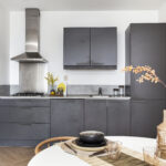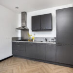 De living loopt haast ongemerkt over in de eetkeuken, die is voorzien van een modern, recht keukenblok met koel-/vriescombinatie, gaskookplaat, RVS-afzuigkap (recirculatie), voldoende werk- en kastruimte en indirecte verlichting.